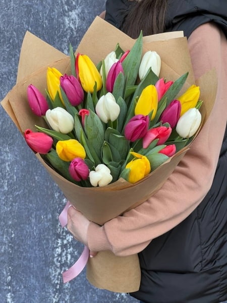 Состав букета: Тюльпан розовый 29 шт, упаковка: калька, атласная лента.